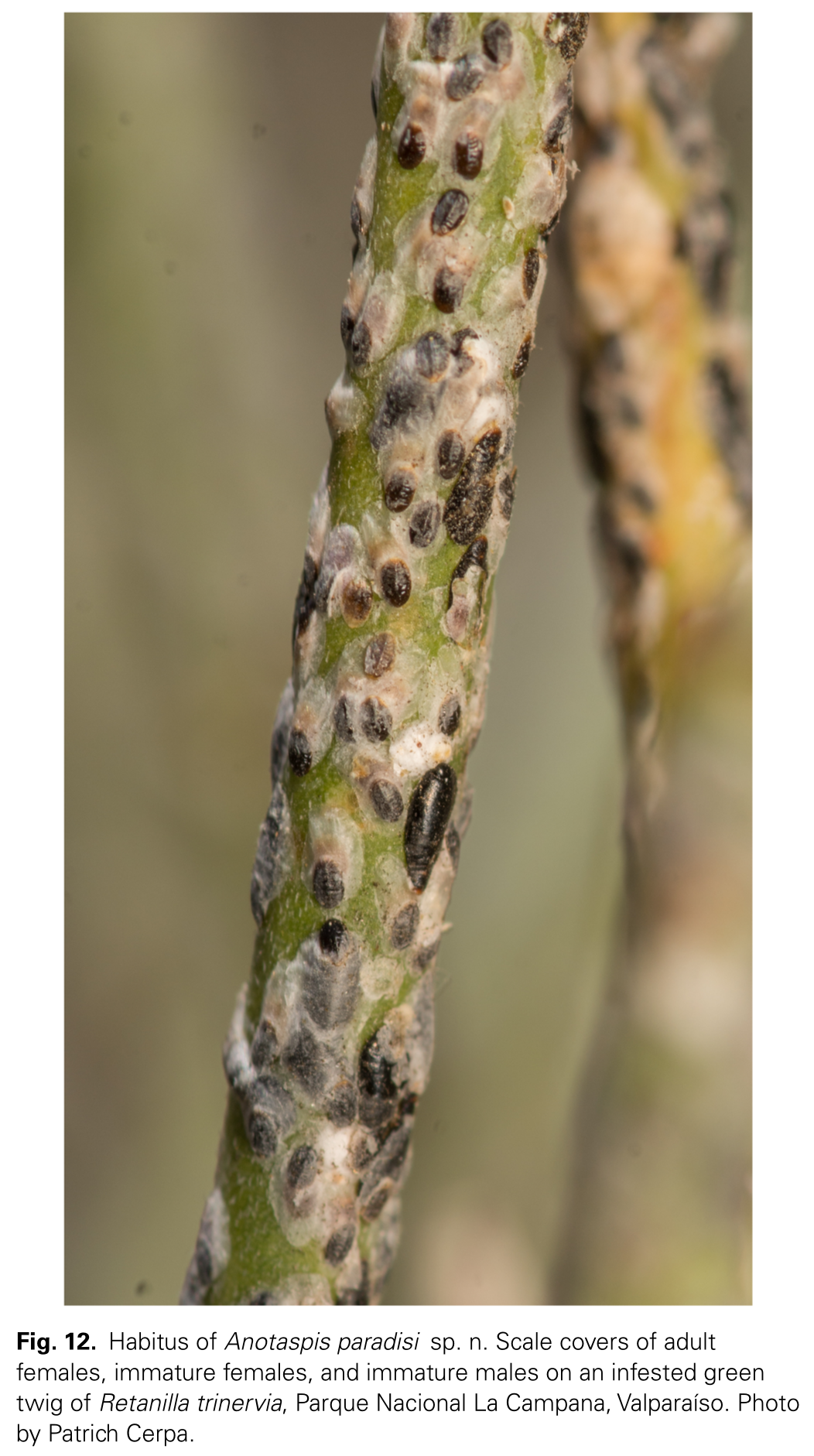 - Anotaspis paradisi Normark, Normark, and Amouroux 2025: 12. Type data: CHILE: Valparaiso, Parque Nacional La Campana, ex. Retanilla trinervia, 2/6/2019, coll. P. Amouroux. Holotype, female, by original designation Type depository: Santiago, Museo Nacional de Historia Natural de Chile, Santiago, Chile ; accepted valid name Notes: Paratypes: 1 adult female and 1 puparium, same data as holotype, slide PA960A-0520 (USNM) Illustr.