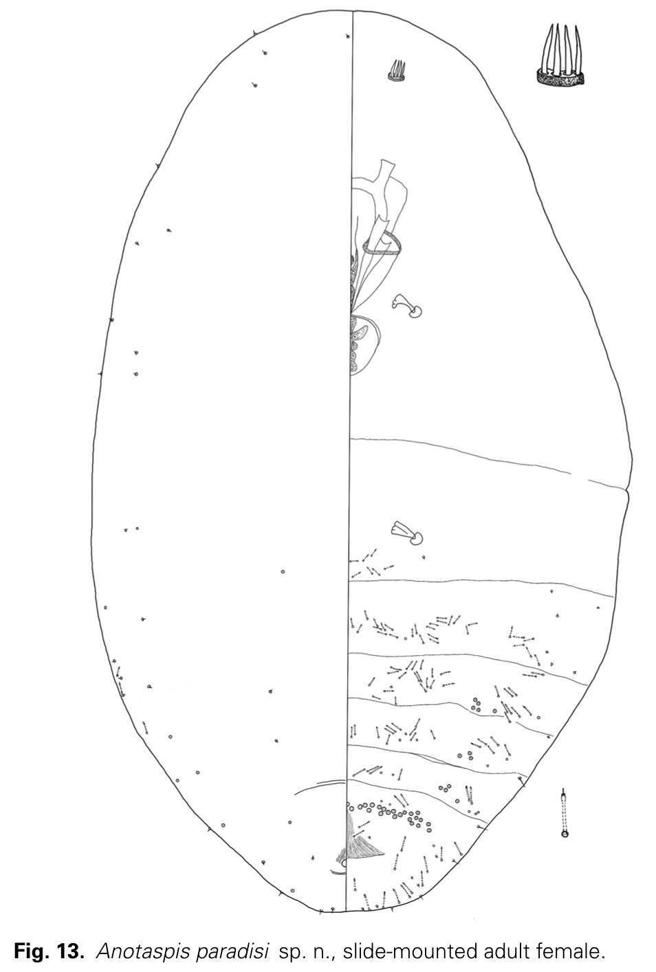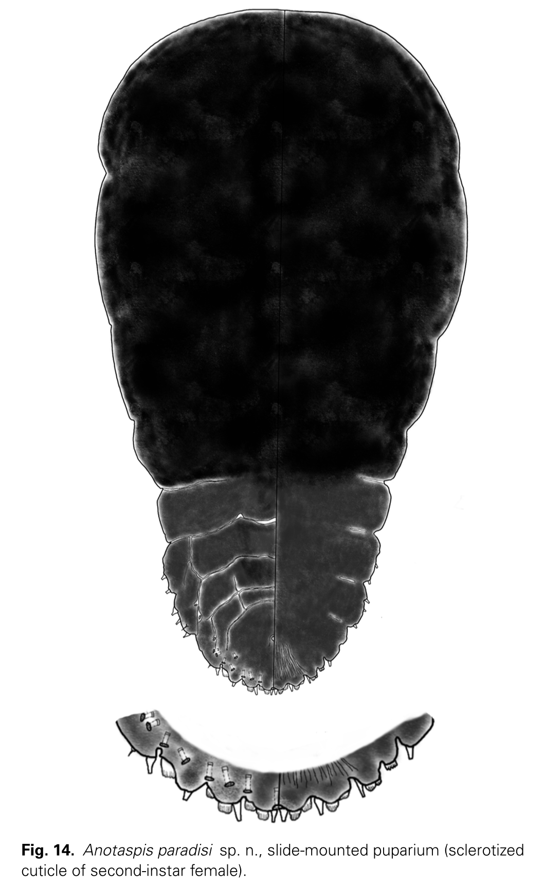 - Systematics: urn:lsid:zoobank.org:act:CE451F43-C4AE-4EAD-9F5F-7CFCF10676A4 The adult female of Anotaspis paradisi resembles that of A. particula in being pupillarial, with multisetose antennae and a simple oval shape, without any gland spines, plates, lobes, or other appendages, and without pores by the anterior or posterior spiracles. The adult female of A. paradisi differs from A. particula in having perivulvar pores and ventral microducts (absent in A. particula). (Normark et al. 2025)