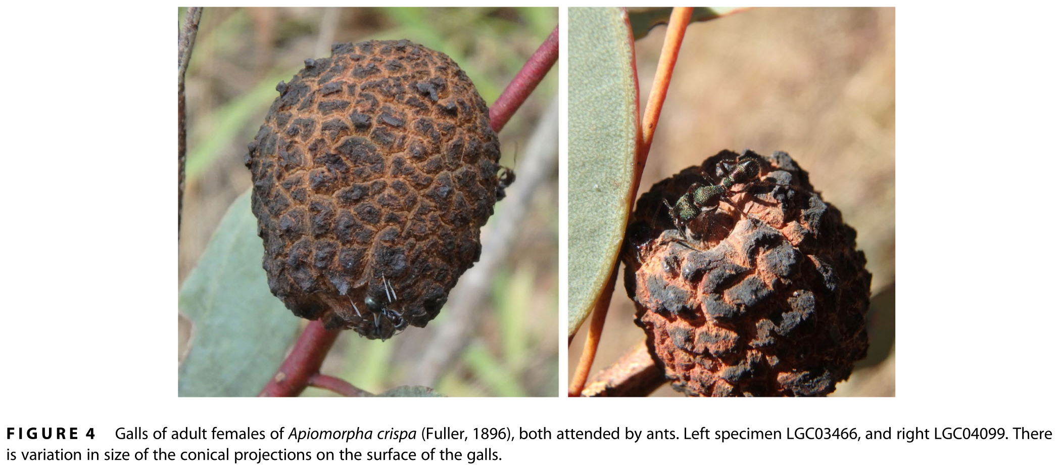 - Systematics: Adult females of Apiomorpha crispa differ from those of A. strombylosa in having fimbriate to subfrimbriate trilabiate spiracles rather than typical trilabiate spiracles, and in having fewer spine-like setae on TII–AI (≤2 on TII, ≤7 on TII, ≤6 on AI). It also differs by inducing galls on E. Sect. AdnatariaLatoangulatae and E. Sect. Maidenaria but never on the same host Sections as A. strombylosa (E. Sect. Bisectae and E. Sect.Glandulosae).