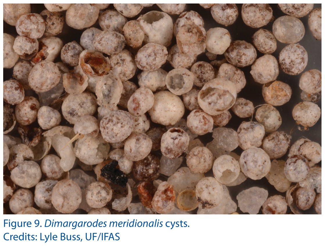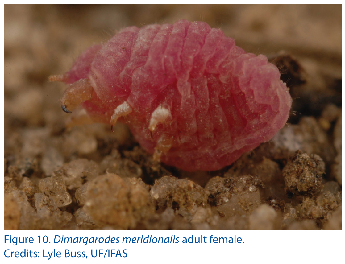 - Biology: Found in Georgia, USA, on roots of various grasses, in great masses estimated to contain up to 1.5 million cysts in an area of 1000 square feet (Jakubski, 1965). Dimargarodes meridionalis are found in the soil up to 25 cm below the surface. Clusters of pinkish-white eggs, covered in a white waxy sac, are deposited in the soil from March to June. The first-stage nymphs emerge from eggs approximately 9–15 days later, attach to the roots of turf grass, and enclose themselves in a hard, yellow-brown, spherical shell or cyst. These cysts range in size from about 0.5 to 1.5 mm. Ground pearls overwinter in the cyst stage and females reach maturity in late spring. Females can reproduce without mating and adult males are rarely observed. One generation may last from 1 to 2 years, or possibly longer depending on environmental conditions. There are no known natural enemies of D. meridionalis. (EFSA2019)