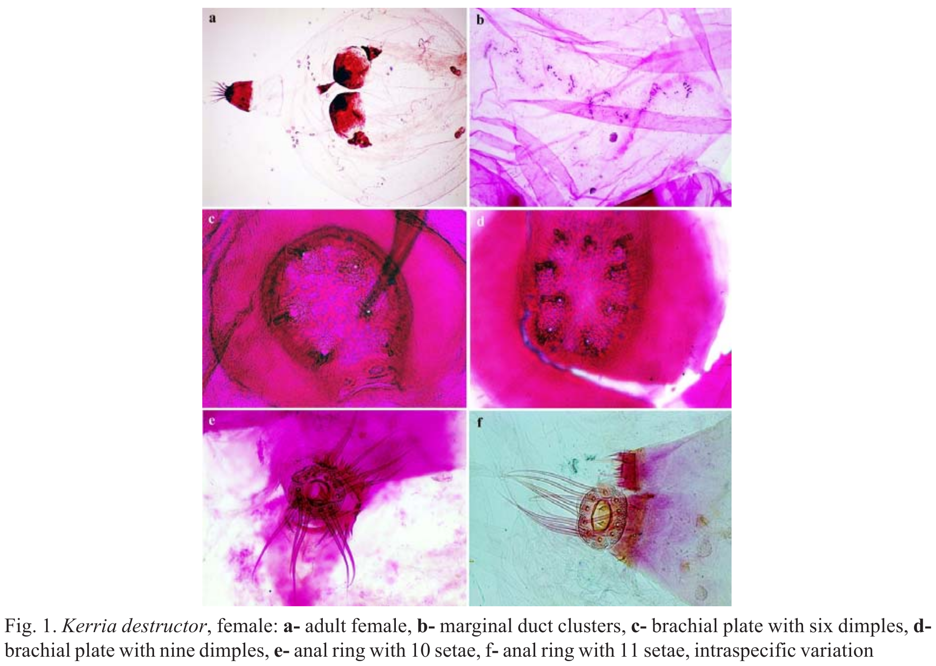 - Systematics: Kerria destructor is similar to K. manipurensis and K. javana. It differs from K. manipurensis in having (character-states in K. manipurensis in brackets): i) brachial plate subcircular with 6–9 dimples (brachial plate quadrate/rectangular with 4 dimples), ii) each anterior spiracle length is smaller or equal to width of brachial plate (1.31x longer than the width of brachial plate), iii) dorsal spine 333–351 (344) μm long; spine equal to the length of pedicel (dorsal spine 155–300 μm long, pedicel shorter than spine), iv) each dorsal duct cluster with 8–15 tubular ducts (with 5–10 tubular ducts), v) posterior spiracles, each 91–114 (104) μm long, without a sclerotised plate, with 40–45 spiracular pores present along one side of spiracle (posterior spiracles each 70–80 μm long, born on a sclerotised plate, with 46–70 spiracular pores present along one side of spiracle), v) each marginal duct cluster consisting of 28–32 ducts (consisting of 43–49 ducts), vi) perivulvar pore clusters: 8 or 9 on each side of anal tubercle (12–14 on each side), and vii) quinquelocular pores near mouthparts absent (present). It differs from K. javana in having (character- states in K. javana in brackets): i) brachial plate subcircular with 6–9 dimples (brachial plate quadrate/rectangular with 4–5 dimples), ii) dorsal spine 1.26x longer than width of brachial plate (subequal in length to width of brachial plate), iii) dorsal spine well developed and well separated from pedicel by a deep constriction (dorsal spine slender, without a deep constriction between pedicel and spine), iv) perivulvar pore clusters: 8 or 9 on each side of anal tubercle (11–13 on each side), v) marginal duct clusters 3 pairs, each marginal duct cluster consisting of 28–32 ducts (marginal duct clusters 6 pairs; each with 37–50 ducts), and vi) quinquelocular pores near mouth parts absent quinquelocular pores near mouth parts present). (Talikder & Das, 2020)
