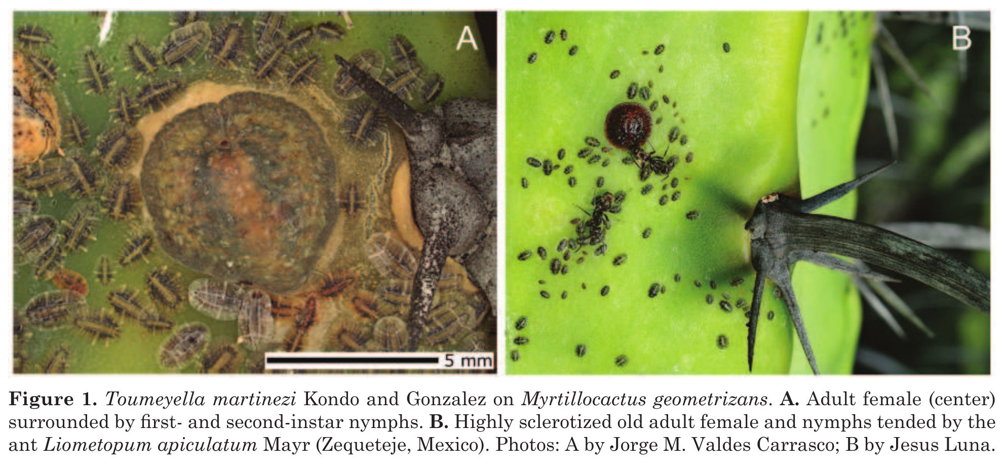 - Biology: The ant Liometopum apiculatum Mayr has been observed in a mutualistic relationship with T. martinezi on the cactus M. geometrizans. The ant feeds on the honeydew excreted by the soft scale and in exchange the ant appears to give protection to the soft scale from its natural enemies as has been reported for other ant species. Toumeyella martinezi is commonly found in the middle part of the plant where there is more fresh tissue over the inter-ridges of the plant cladodes.