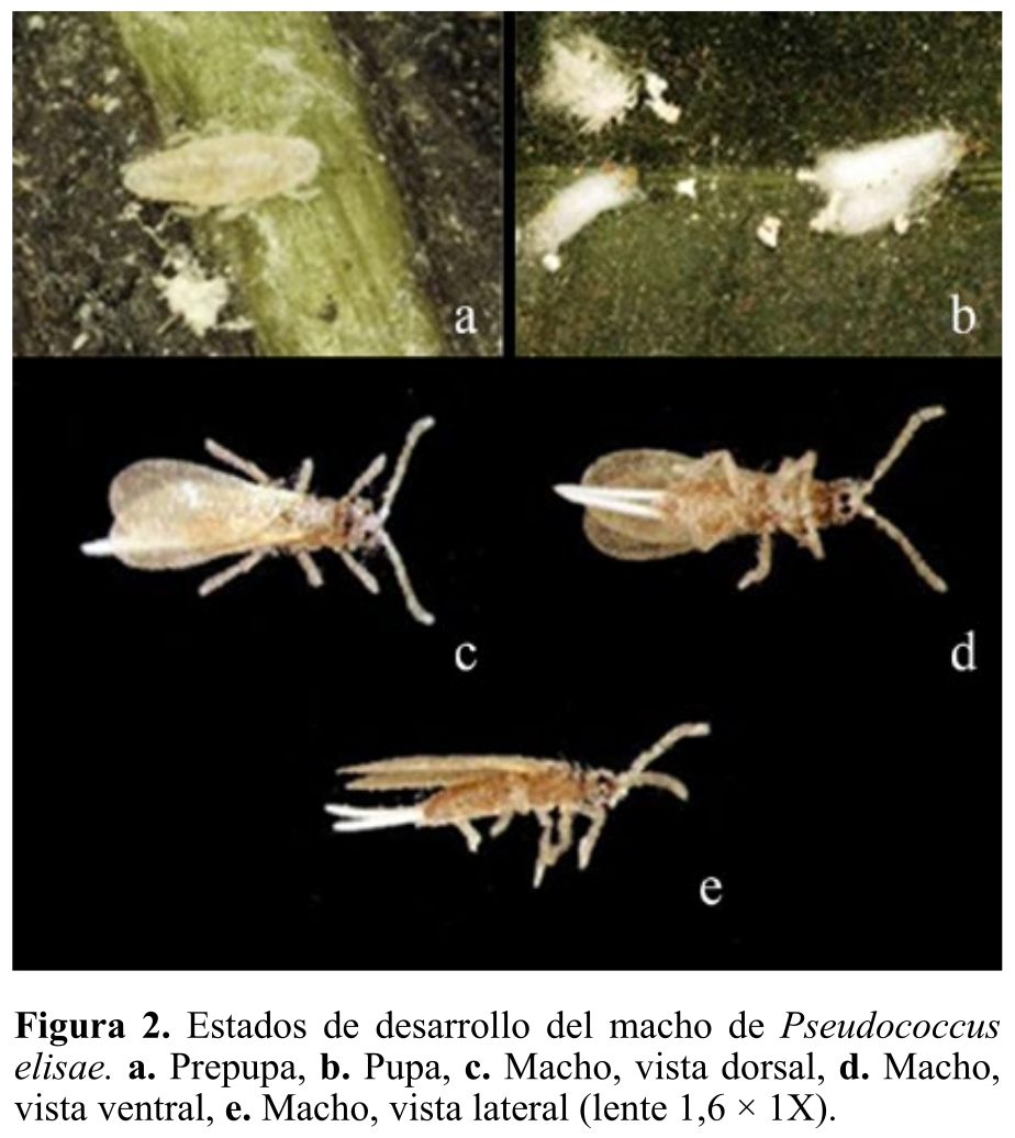 - Structure: The species has 17, rarely 16, pairs of thin waxy filaments that are short on the head and long on the anal lobe. The length of the body is 2.6(1.7-1.8) mm long; body length / caudal filament is 2.1(0.9-1.8). The body is lightly dusted with a white wax that does not completely conceal the pale orange body; the crushed body of the adult female is reddish brown. An ovisac is produced that is longer than or equal to the length of the body of the adult female and encloses the eggs. The species occurs on the foliage and the fruit of the host. (Gimpel & Miller, 1996) Using the SEM, it was possible to identify the presence of morphological variants of tubular ducts, those with a sclerotized oral ring, those not sclerotized and a third extended type. Different types of multilocular pores with ten lobes, those with a continuous internal opening and those with a flange on the periphery. Ostioles with an internal membranous extension.The presence of the typical circulus in between segments III and IV and an apparent second circulus in some specimens between segments IV and V. The ultrastructural characteristics observed from prior identification of the species P. elisae complements the work done with the conventional technique. (Palma-Jiménez & Blanco-Meneses, 2019)
